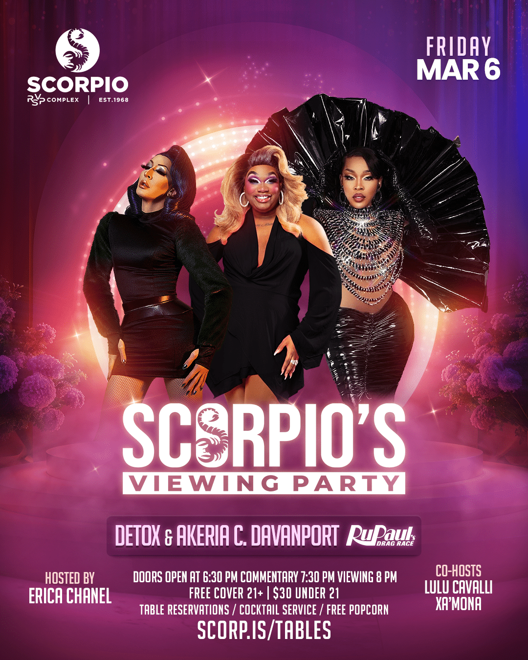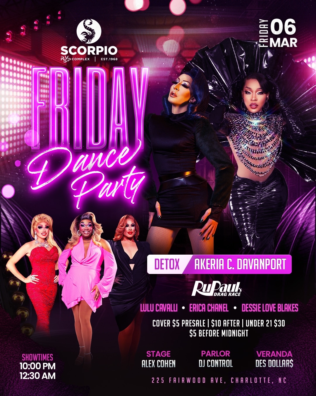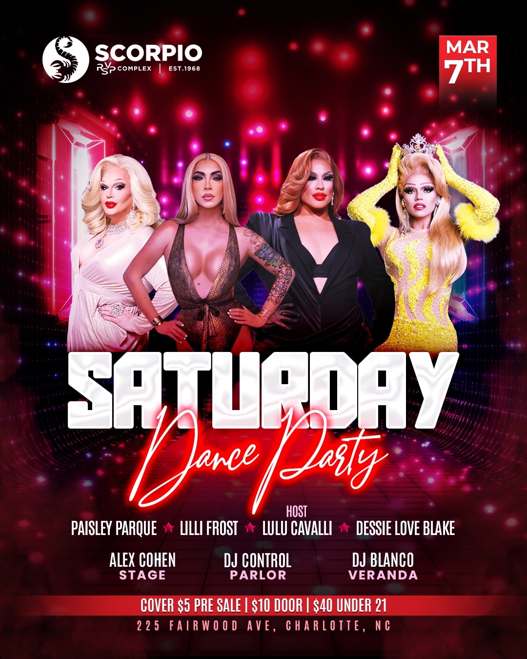 At the re-imagined Scorpio, we’re bringing you top-tier entertainment with dazzling drag shows, featuring some of the most talented queens in the industry. Our lineup includes headliners from prestigious competitions and beloved local favorites. In addition to our fabulous drag shows, we’re excited to host international recording artists who will take the stage and fill the venue with electrifying live music. Our DJ lineup is just as impressive, featuring world-renowned DJs who will keep the energy high and the dance floor packed. Join us for nights filled with music, dance, and pure entertainment!